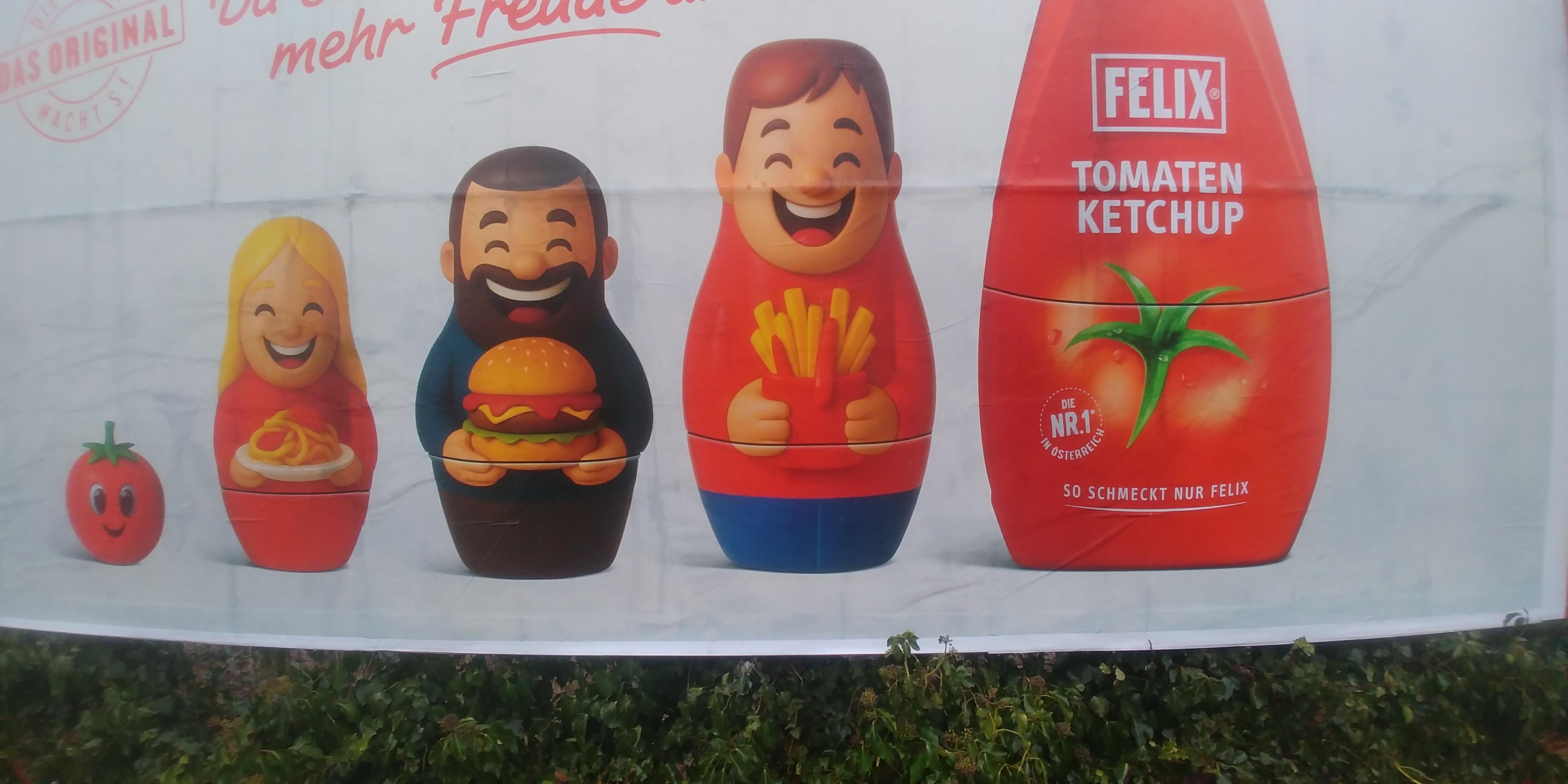 先ほど見たのですが、本当にひどいですね。誰かが広告代理店のオフィスに座って、このテイクを見て、このケチャップを見た "スティック" またはフライドポテトに何を載せるべきかを考えて、次のように考えます。 "いいですね、それはうまくいくかもしれません! 最も高価なケチャップは、入手可能な最も安価な広告を使用しています。食品業界は単純に 75% が詐欺です。 Austria