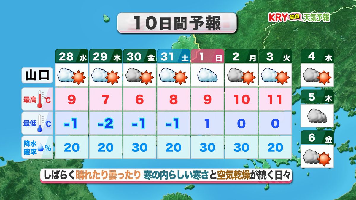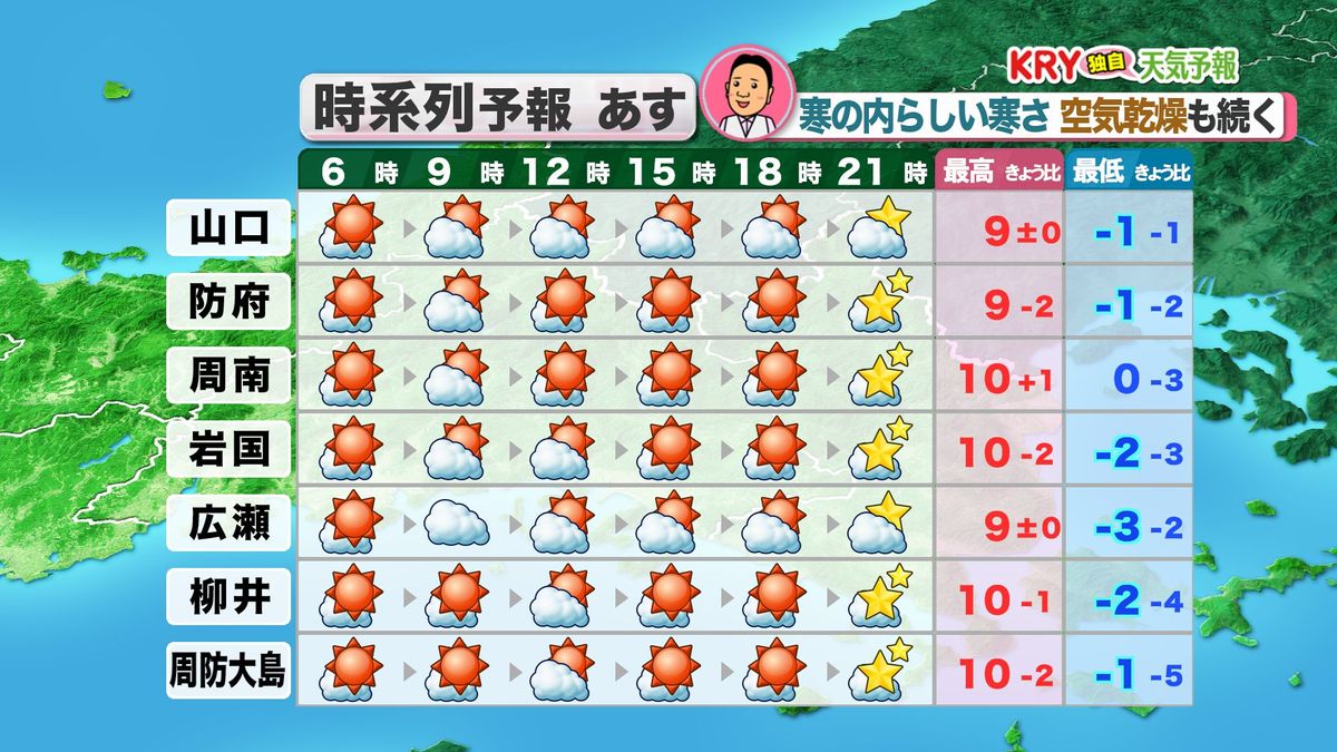 あす28日(水)は緩いながら冬型の気圧配置が続くことで、日本海側ほど寒気の影響で曇りがちの天気。瀬戸内側では晴れ間十分の所が多くなりますが、朝の気温は広く氷点下、最高気温も多くの所で1桁止まり、と寒の内らしい寒さが続きます。徳佐方面は時折雪がちらつくことがありそうですが、広い範囲での天気の崩れはなく、空気の乾燥した状態も続きそうです。
