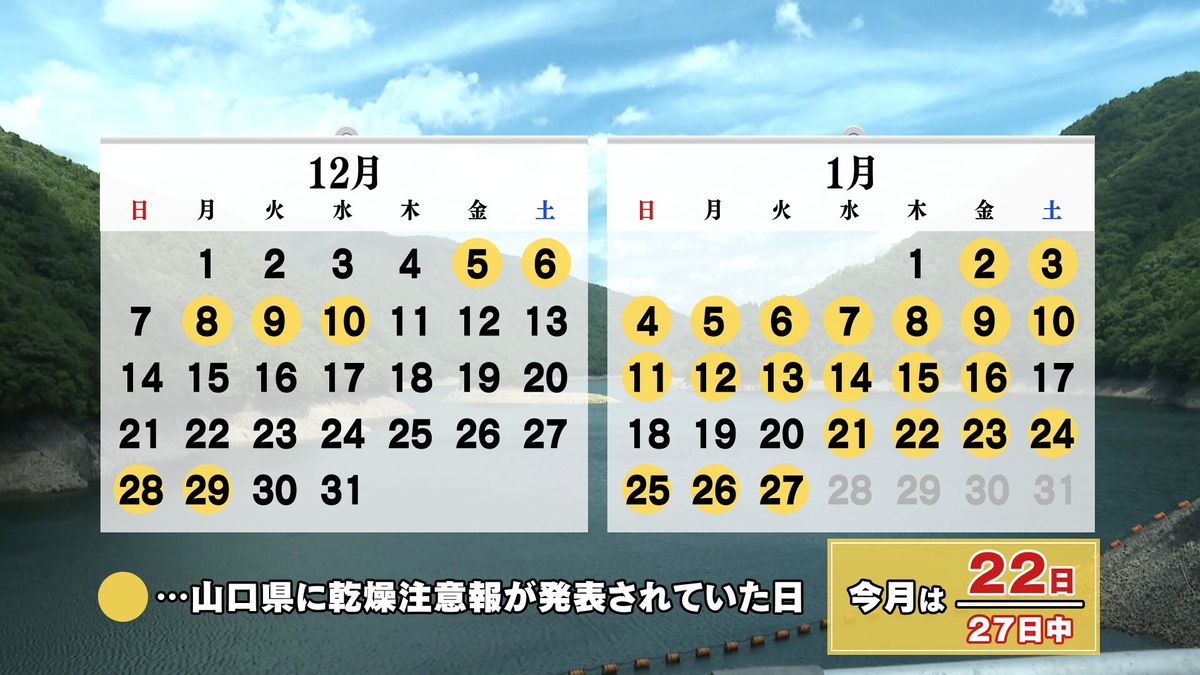 県内を含む西日本は、九州や太平洋側、そして瀬戸内側を中心に、秋の終わりから極端に雨が少ない状態が続いていて、特に最近1か月の降水量は平年の1割程度しかない所も、県内では多くなっています。この少雨の中で、防府市や周南市を中心に生活用水などを供給する佐波川ダムと島地川ダムでは、ダムの貯水率が低下したことで、きのう26日(月)から生活用水、工業用水、農業用水のいずれも一律で10パーセントの取水制限を開始しました。