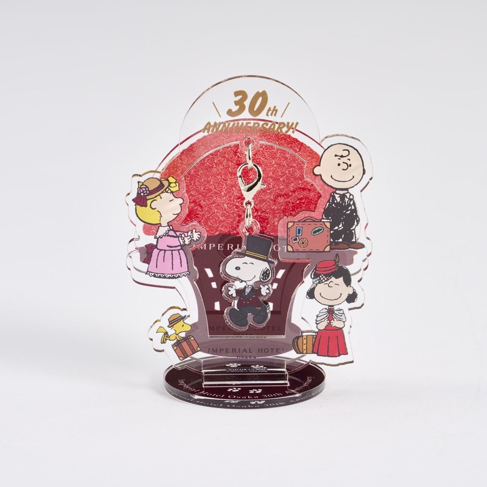 赤いバラのプリザーブドフラワーを背景に、本ホテル開業当時のドアマンの制服を着たドアマン・スヌーピーと仲間たちをあしらったアクリルスタンド。中央のスヌーピーは取り外しが可能で、チャームとしても利用できる。3月15日発売で、価格は2200円。