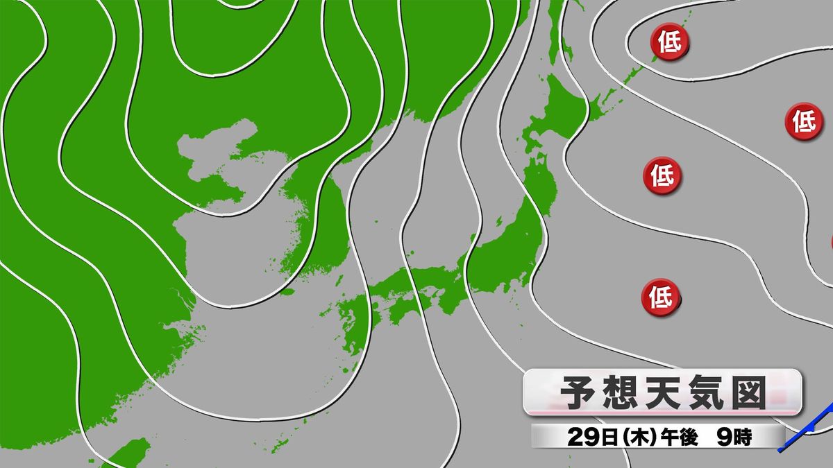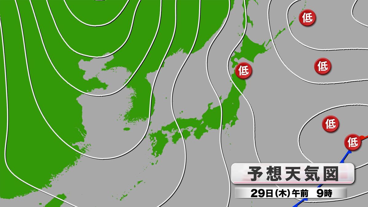 きのう28日(水)に引き続き、日本の周辺は西高東低 冬型の気圧配置で、きょう29日(木)は午後になるほど県内付近の等圧線の間隔が狭くなる予想です。