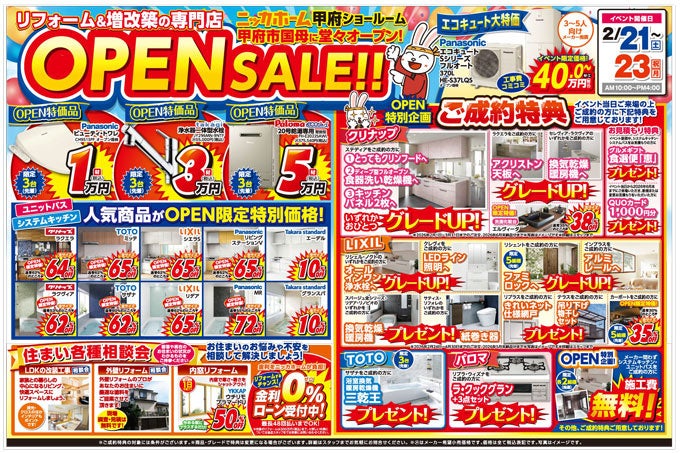 山梨県内初の常設拠点として、地域の皆さまに寄り添ったリフォームサービスの提供を目指し、オープンを記念した3日間限定のイベントを開催します。
