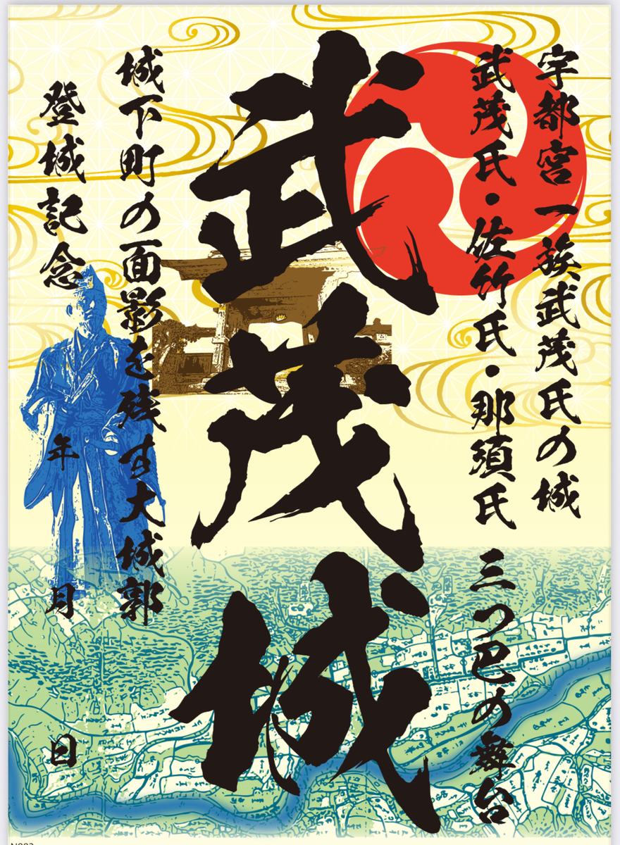 武茂城の御城印には、武茂氏の祖武茂泰宗の銅像と家紋、さらに菩提寺乾徳寺の山門をデザインしました。乾徳寺山門は、武茂城の城門とも伝わります。あわせて、江戸時代の武茂城周辺の様子がよく分かる馬頭村絵図をモチーフにしました。