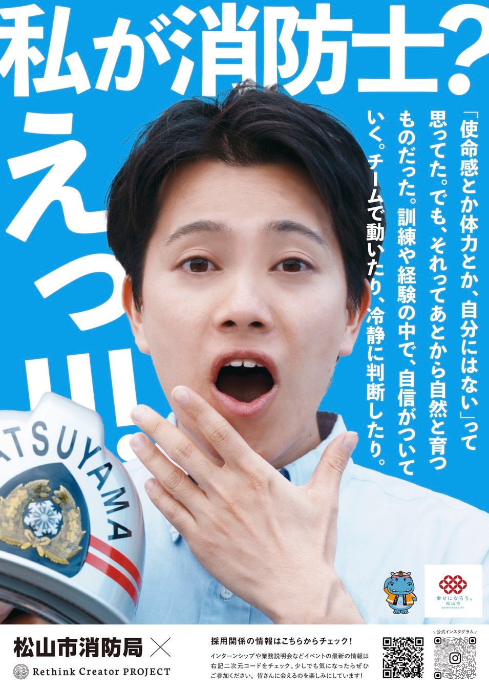 プロフェッショナル人財の育成を通じて、クリエイターに新たな働き方を提案する株式会社クリエイターズマッチ(本社:東京都港区、代表取締役:呉京樹、以下、「クリエイターズマッチ」)が主催する『Rethink Creator PROJECT』は、JTがパートナーの皆さまとともに行う地域社会への貢献活動「Rethink PROJECT」協賛のもと、2025年7月より「地域デザインファクトリー松山」に取り組んできました。松山市が抱える課題の解決に向け、地元クリエイターが「消防職員の募集」を目的としたポスター・パンフレットを制作しました。