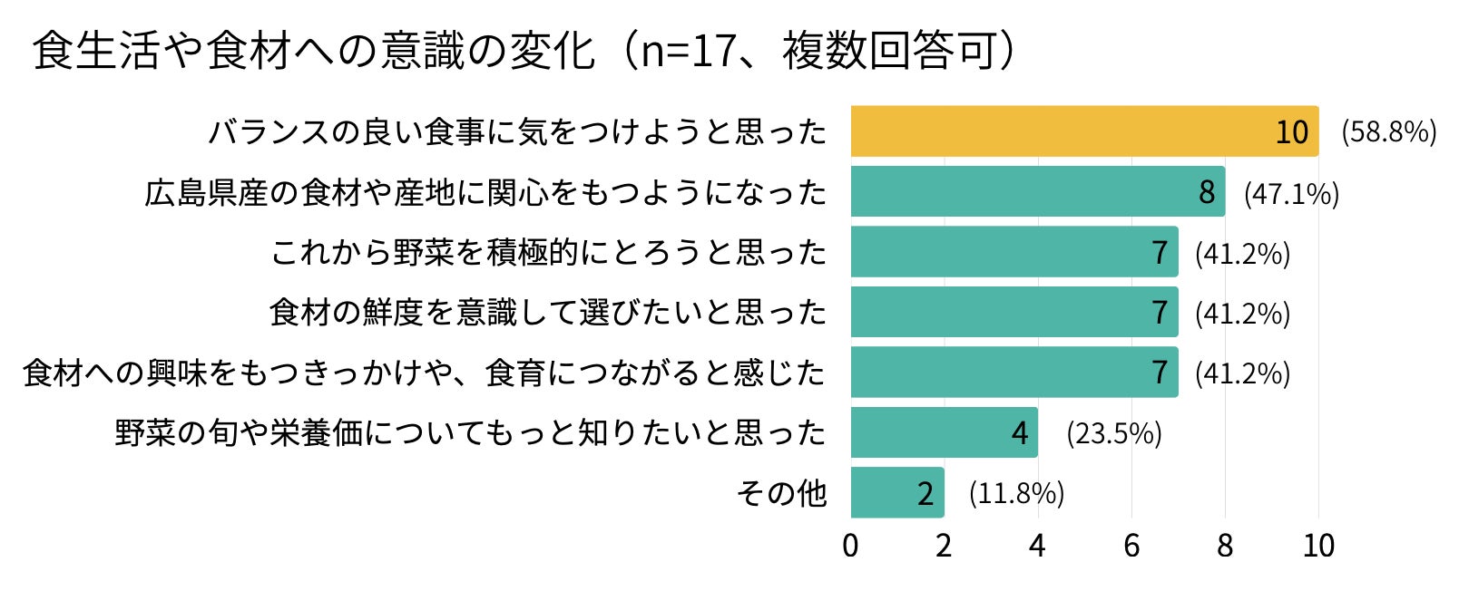本サービスにより野菜セットを受け取った従業員へのアンケート(n=23)では、7 割以上が健康的な⾷⽣活や⾷材への意識が⾼まったと回答しました。さらに、その回答者を対象に⾏った設問では、「バランスの良い⾷事に気をつけようと思った」との声が約 6 割と最も多く、従業員へ野菜を提供することが⾷⽣活を⾒直すきっかけになることがうかがえます。