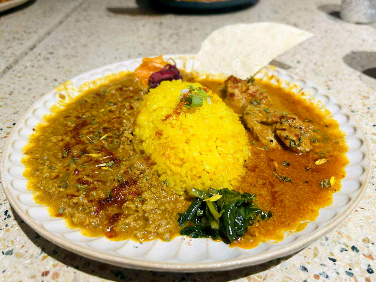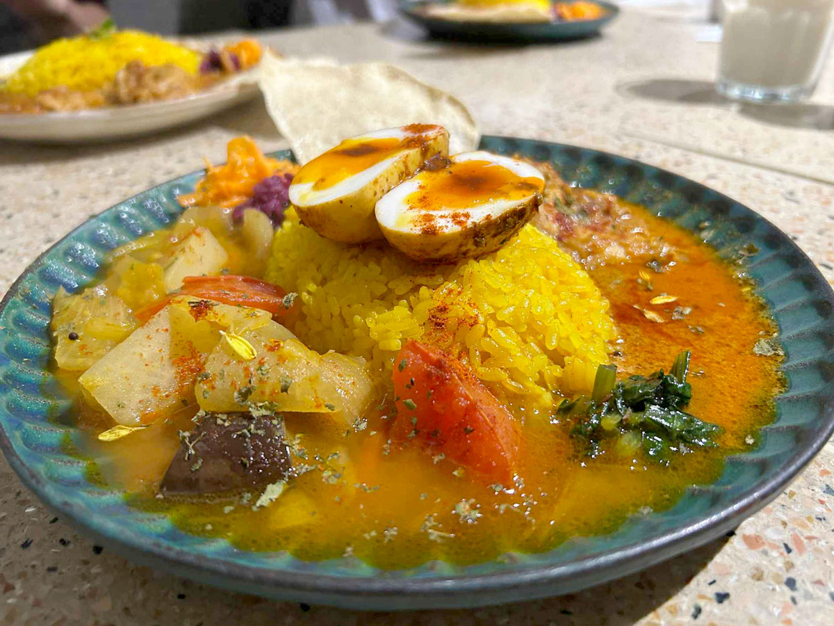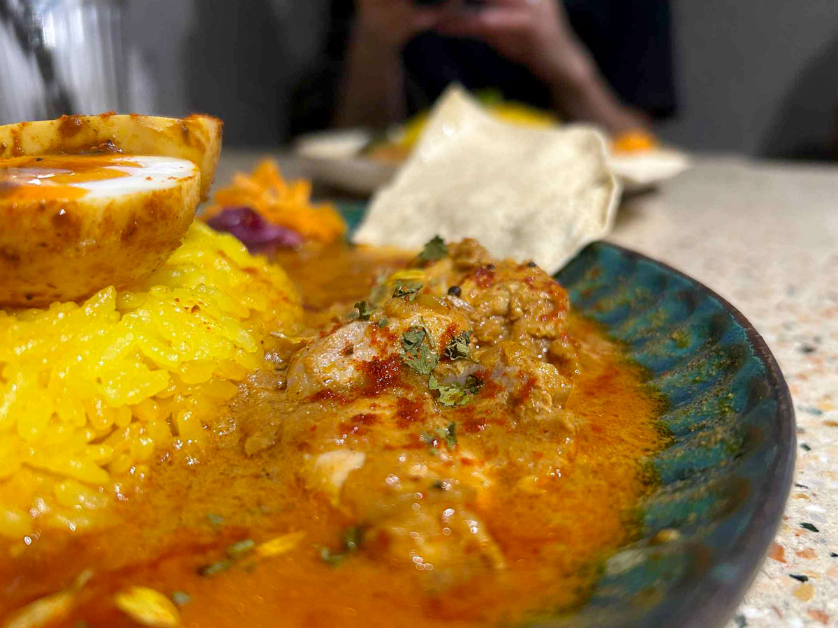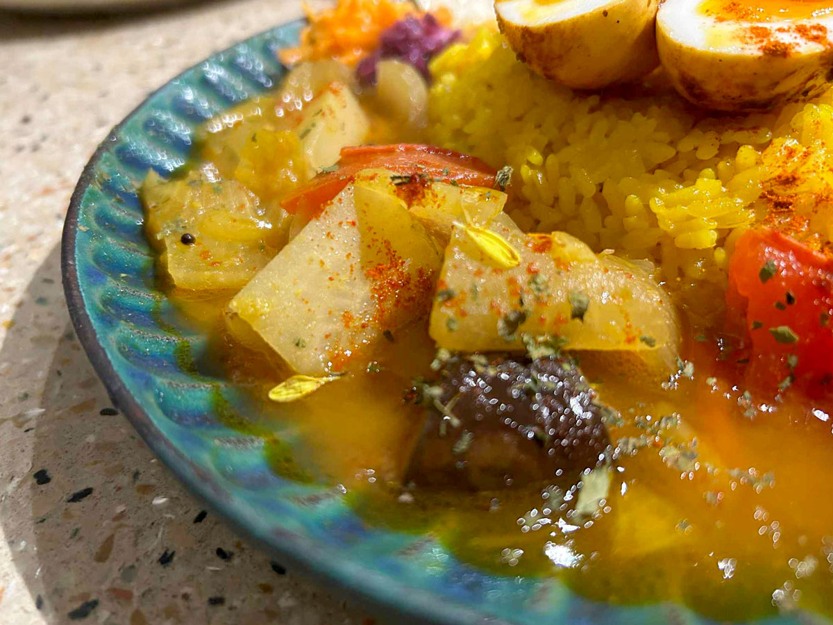 オープンした頃は、皿に小分けにしたミールス形式で提供していた。1年ほど前から1つの皿にに盛り付けることに変更した。「食べ方が分からないという声を多くもらった。分かりやすさ重視です」と関戸さん。