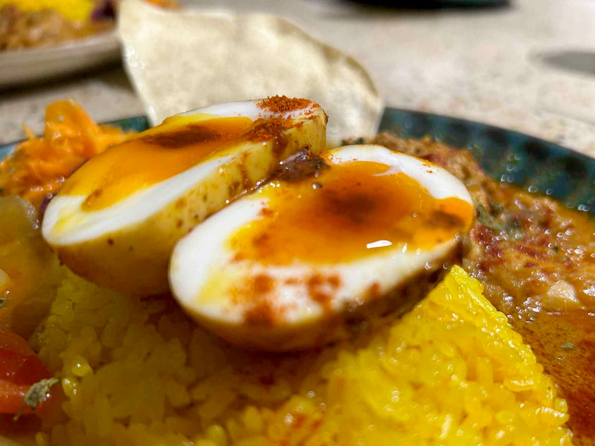 この日のカレーは、「ケララチキンカレー」「ベジタブルカレー」「ポークカレー」の3種類。トッピングは、目玉焼き・スパイス玉子・パクチー・炙(あぶ)りチーズなどが選べる。自身にも子どもがいるからなのか、開店当初から「お子様カレー」も準備している。