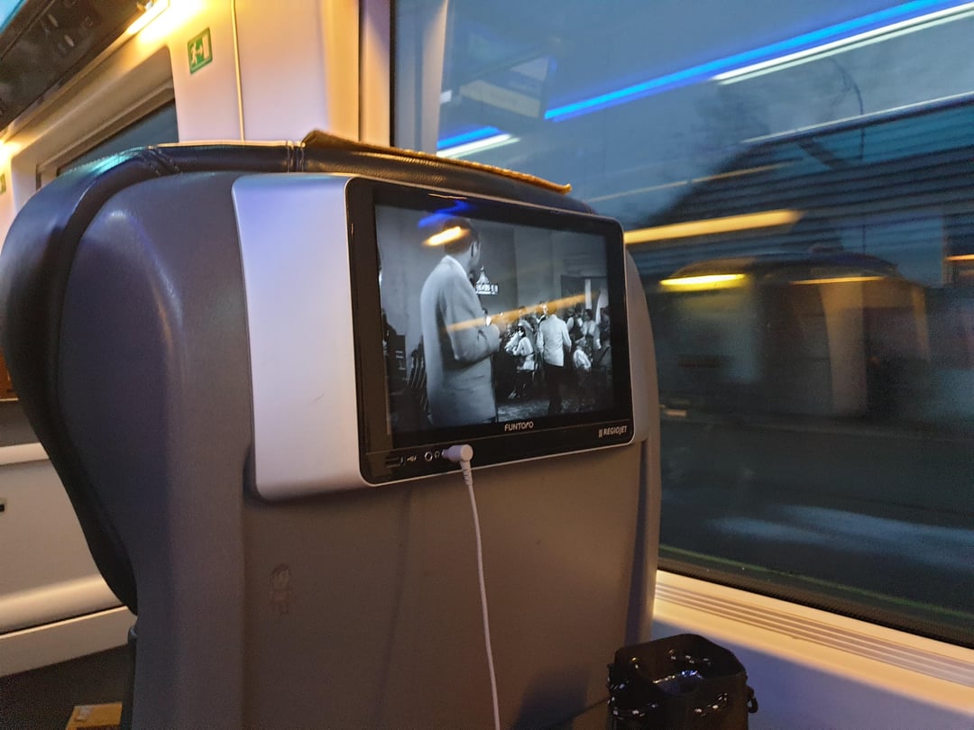 各座席にはタブレットが備え付けられており、映画やゲーム、新聞などが楽しめる。私たちは時速120kmで走行しています。ショックを受けています。