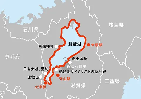 「「ビワイチ」とは、琵琶湖一周の略称のことで、約200kmのルートです。湖岸沿いには平坦な区間が多く、自転車走行を想定した整備が進められているため、初心者から経験者まで幅広い層が走りやすい環境が整えられており、休憩拠点や自転車店などのサイクリスト向けの支援施設も各地に設けられています。琵琶湖一周のルートのほか、滋賀県内の観光地や景勝地を巡る「ビワイチ・プラス」と呼ばれるルートもあります」
