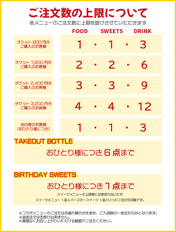 ・店内で提供したメニューは衛生上、お持ち帰りいただくことができません(テイクアウトメニューを除く)。