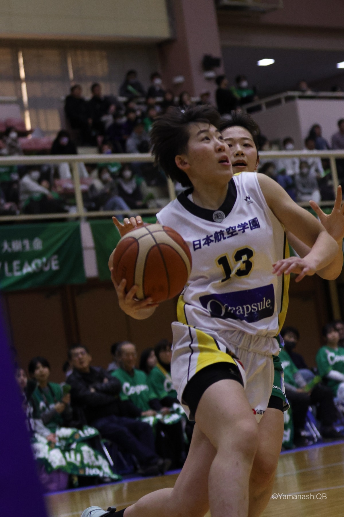 第2クォーターは樋口の得点で再開。それでも上長の3ポイントですぐに応戦し、さらに上長、ハディの連続得点で残り8分強、18-22まで追い上げる。だが要所でのファウルが響き、舘山、高田にフリースローを献上。20-26と再び引き離される展開となる。
