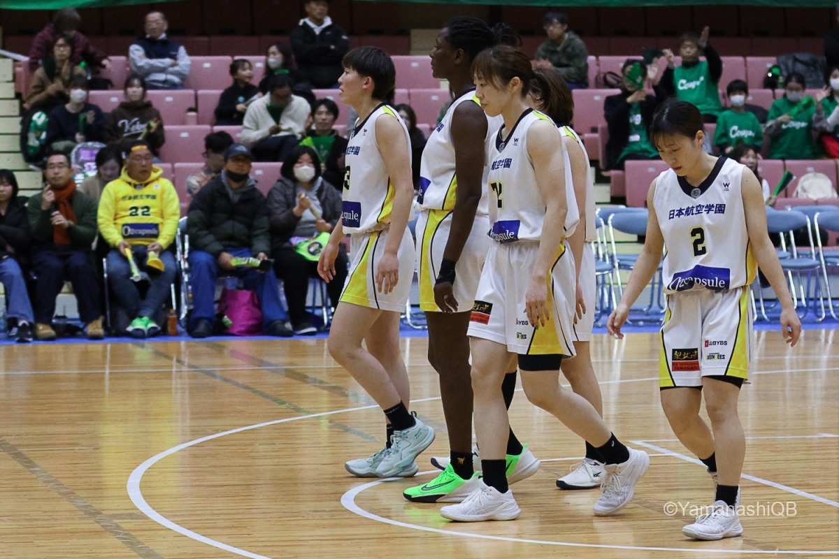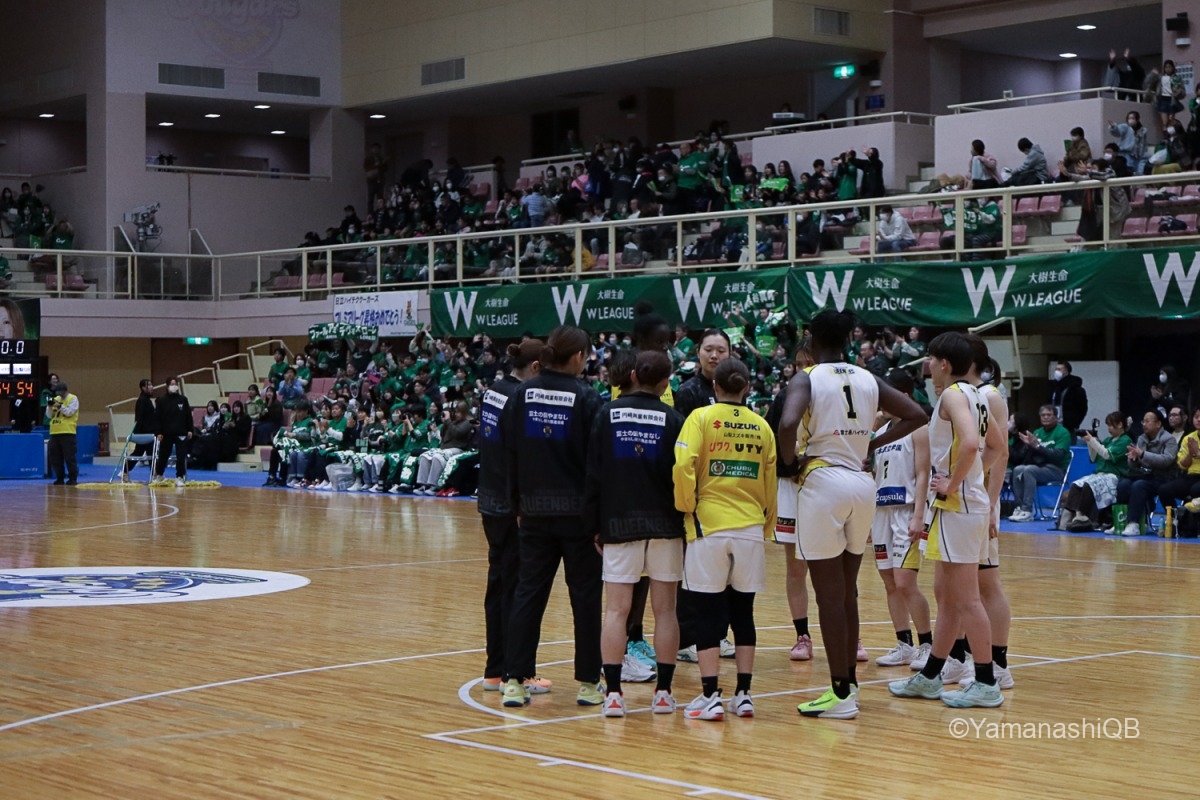 残り3分、クィーンビーズはゾーンディフェンスに切り替え、池田の3ポイントで40-40と再び同点に追いつく。しかし直後、オフェンスリバウンドから粟谷の3ポイント、中野の得点を許し一気に5失点。残り2分21秒、40-45でタイムアウトを取るが、さらに樋口に3ポイントを決められ、42-48。6点ビハインドで最終クォーターへ突入した。