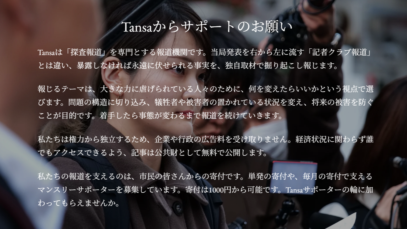 TM特別報告書について報じながら、取材を続けます。統一教会と自民党の癒着について、明かされていない内部情報をお持ちの方は、ぜひTansaまでお寄せください。責任を持って情報源を秘匿し、お守りします。
