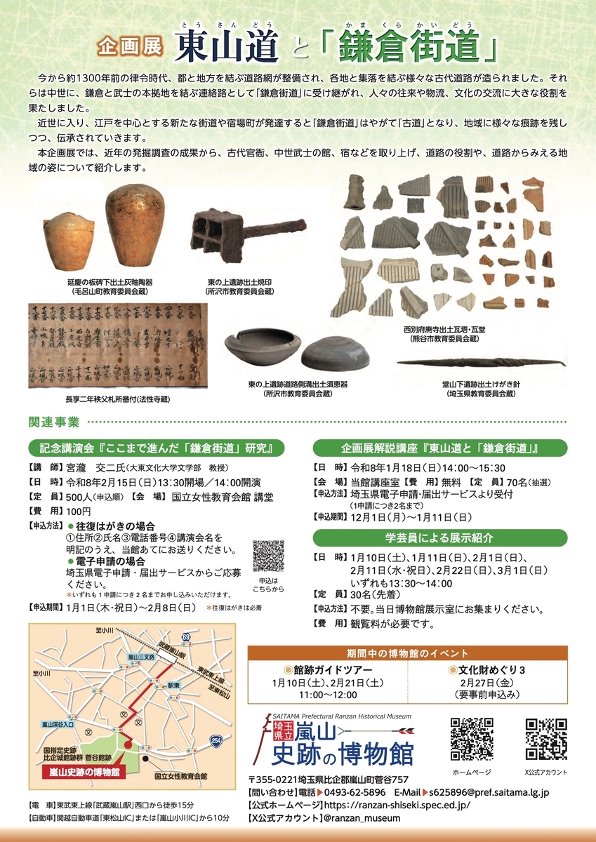 現在、嵐山史跡の博物館(埼玉県嵐山町)において令和7年度企画展「東山道と『鎌倉街道』」が開催中です。3月1日(日)まで。