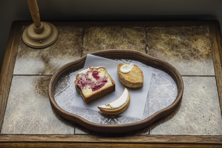 「ベリーミルクパウンドケーキ」はホワイトチョコレートのやさしい甘味に、フランボワーズの華やかな甘酸っぱさが心躍ります。レモンの形が可愛いスコーンの「レモンとローズゼラニウム」は、さわやかなレモンにバラのような香りがほんのりと伝わってきてうっとり。店を象徴する月の形が目を引く「レモンサンドTsukiクッキー」は、レモンのキュンとした甘酸っぱさから元気をもらえます。