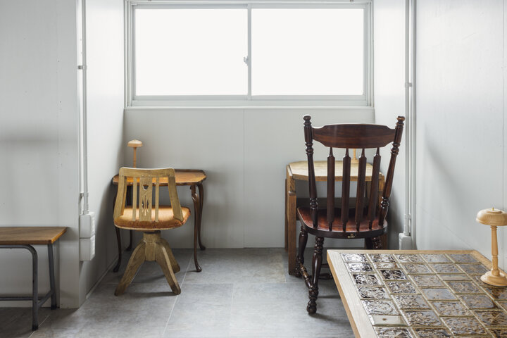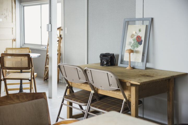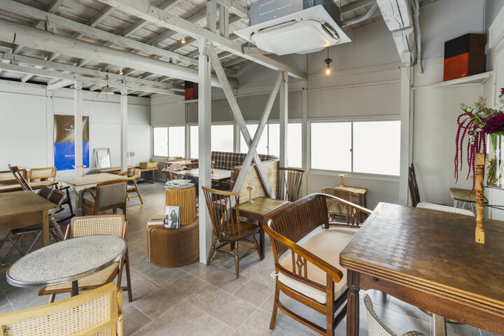 2階にあるカフェスペースは、10歳以上の方に入店が限られた空間。テーブルと椅子のデザインが全て異なり、程よいコントラストを生み出しています。