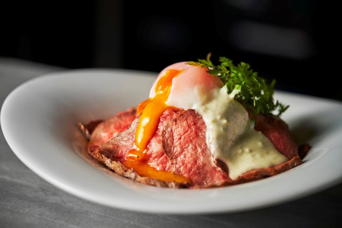 鳥取和牛もも肉を贅沢に使用した、鳥取フェアの人気No.1メニュー。低温でじっくりと火入れした鳥取和牛もも肉に、自家製ソースステーキと温泉卵をトッピングしてボリューミーに。