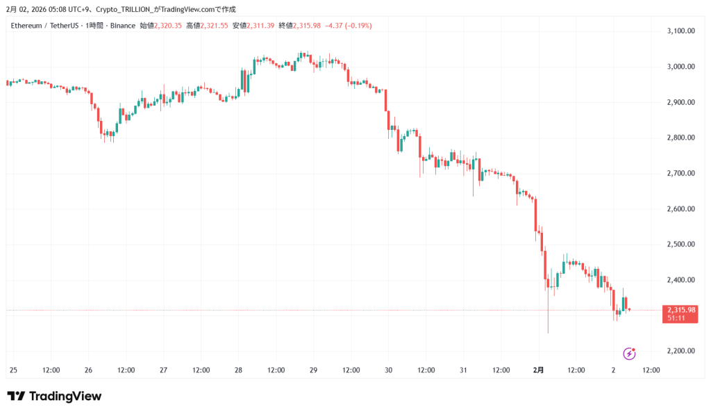 2日5時現在のイーサリアムの価格は2,320.35USDT、前日同時刻比で-2.6%の下落となっている。