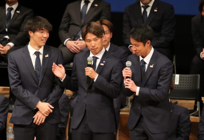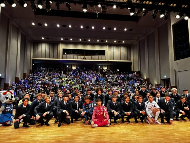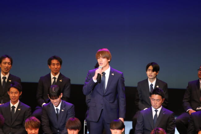 選手全員、コーチングスタッフ、通訳、メディカルスタッフ全員が揃って一人ひとりのスピーチも行われた。500枚限定のチケットは売り切れで会場は満員。