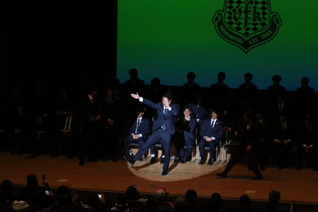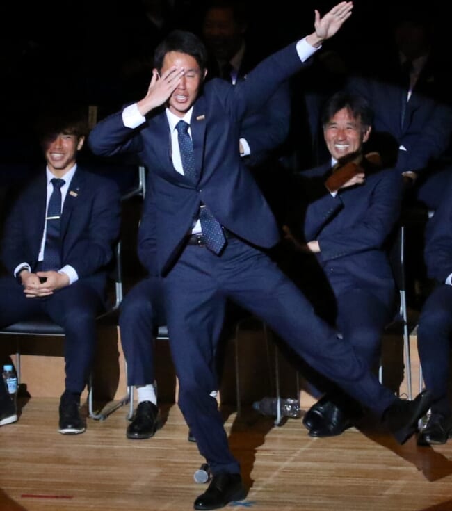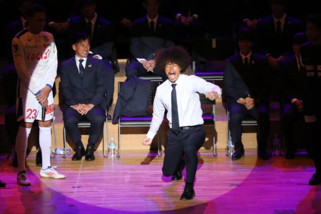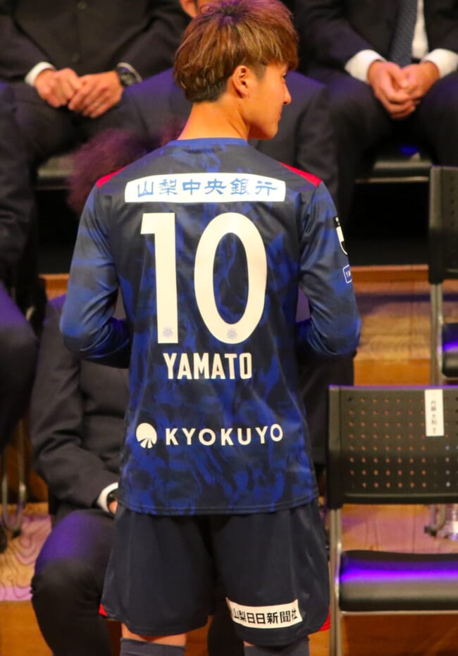 個々のスピーチでは静岡キャンプ後、山梨に戻ってから丸刈りにした安田虎士朗が”丸刈りキャラ”を総取りで沸かせた。最初は野球部キャラでスィングも見せ、「目標は甲子園出場」といい感じ。そして、隣の三平和司のスピーチではキャプテン翼の登場人物で”丸刈り”の”石崎(了)くん”も獲得してファン・サポーターの皆さんに”丸刈り”イメージを植え付けた。