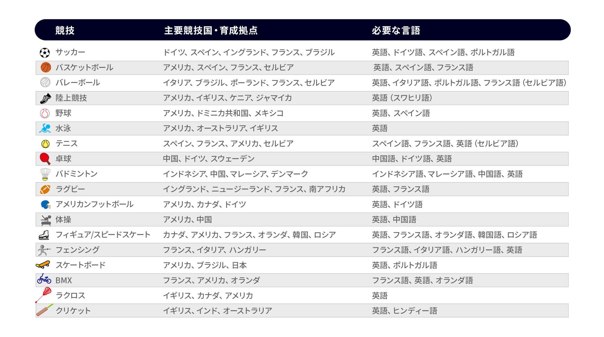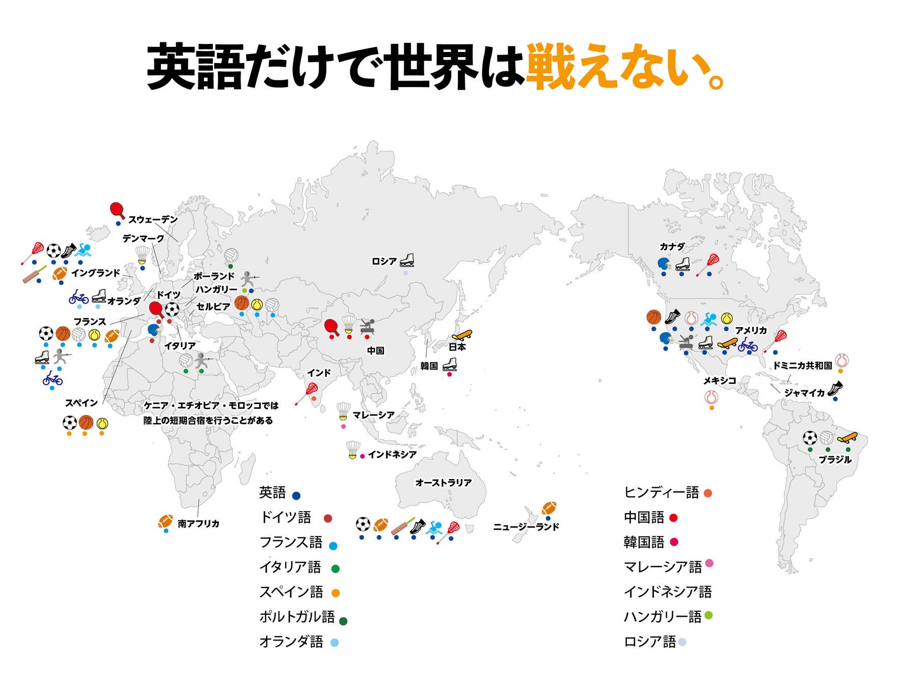 ドイツ語、スペイン語、フランス語、イタリア語、ポルトガル語、中国語、インドネシア語など、実際にスポーツ留学や移籍、国際大会の多い地域の言語に対応。