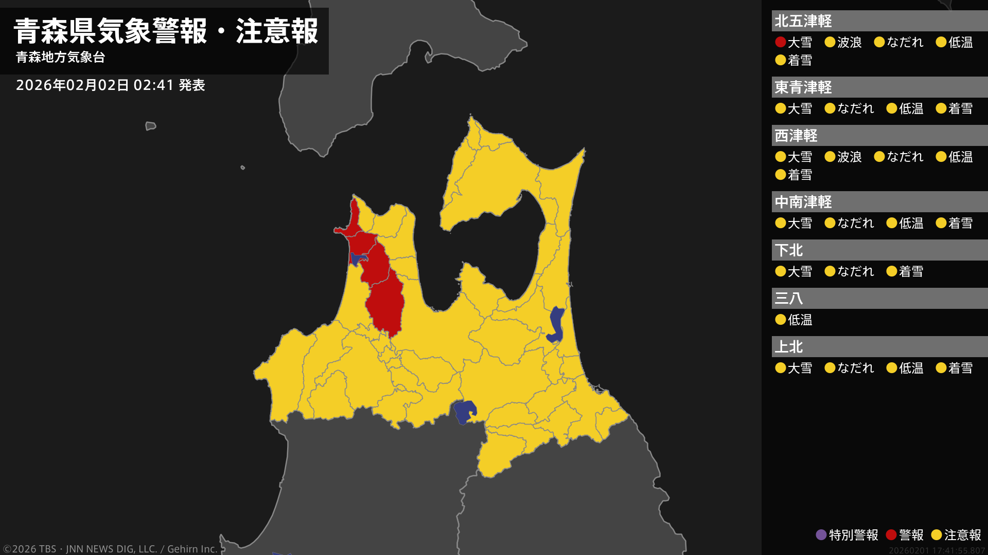 【大雪警報】青森県・五所川原市、中泊町に発表 2日02:41時点