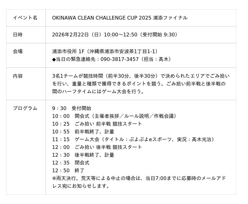 本プロジェクトでは、ごみ拾いとeスポーツを掛け合わせた取り組みにより、楽しみながら環境問題に向き合う機会を創出してきました。そして2025年8月30日に開催された「沖縄STAGE」、10月12日に開催された「石垣STAGE」、12月6日に開催された「糸満STAGE」の各予選大会では、累計30チーム60人にご参加いただきました。今回の浦添ファイナルでは、この各予選STAGEの上位16チームが集結し、ついにその頂点が決まります。なお、優勝チームには、琉球コラソンのアウェー戦を現地で観戦できる「往復航空券付き観戦チケット」が贈られる予定です。