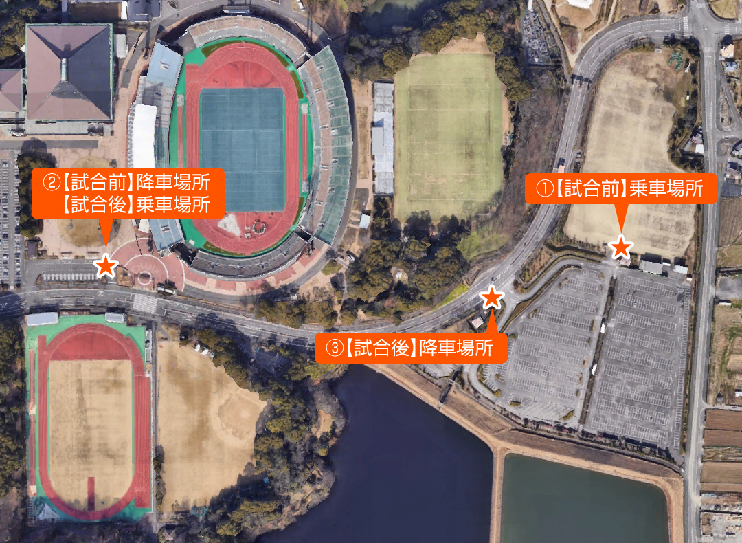 試合終了後の降車場所について、タクシーが駐車場内に進入した場合、場内の混雑によりスムーズなピストン輸送に支障をきたす恐れがある為、試合終了後の降車場所は「東駐車場入り口」とさせていただきます。