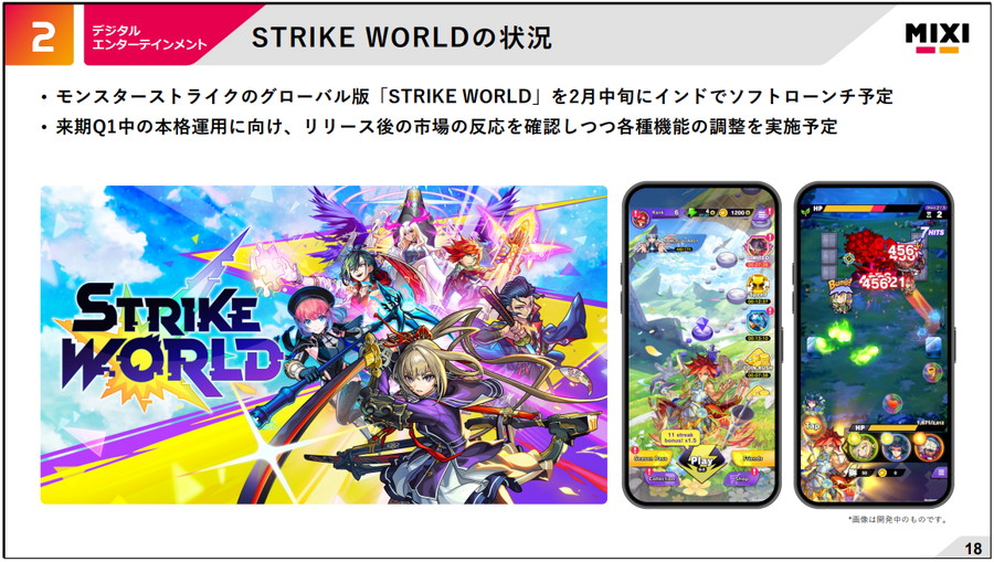 MIXI<2121>は、1月30日の第3四半期の決算説明会(テレカン)において、『モンスターストライク(略称:モンスト)』のグローバル版『STRIKE WORLD』について、2月中旬にもインドでソフトローンチを行うことを明らかにした。これまでは2026年3月期中にリリースを目指すとしていたが、2027年3月期 第1四半期からの本格稼働に変更になった。