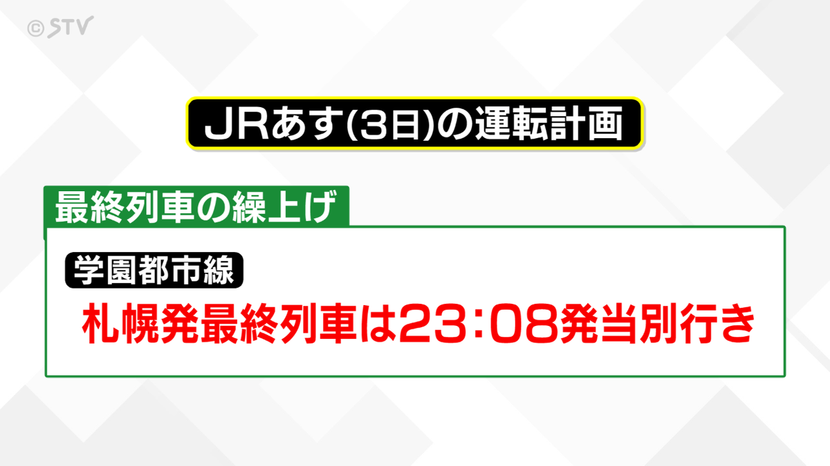 学園都市線の札幌発最終列車は午後11時08分当別行きとなっていて、すでに3日はあわせて124本の列車が運休するということです。