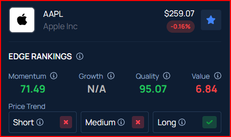 BenzingaのEdgeランキングでは、Appleは質の面で上位5%、勢いの面で上位30%に入っており、強力なパフォーマンスを反映している。Benzingaのスクリーナーを使用すると、Appleのパフォーマンスと同業他社のパフォーマンスを比較できる。