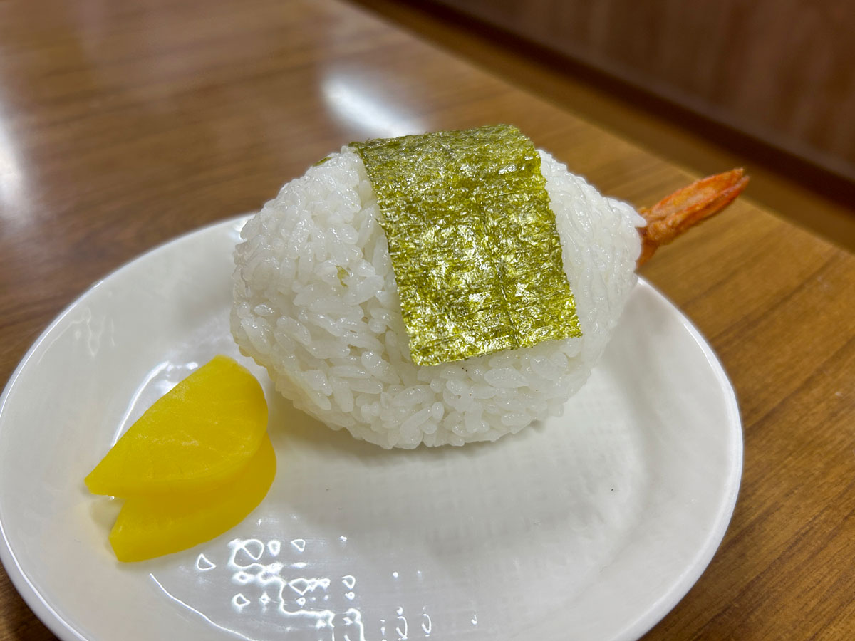 麺は中細麺でスープがよく絡み、すすりやすい。カツとスープのインパクトが大きいが、麺とチャーシューは程よさを追求している。(この味を)長く愛してもらうためには、どちらの要素も必要なのだろう。スープの塩分強目を助けるためには、拳より大きなおむすびにエビ天の尻尾が出る「天むす」(180円)と一緒に食べるといい。14時までは100円追加でご飯を付けることができる。