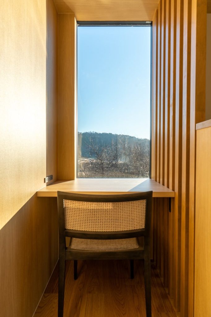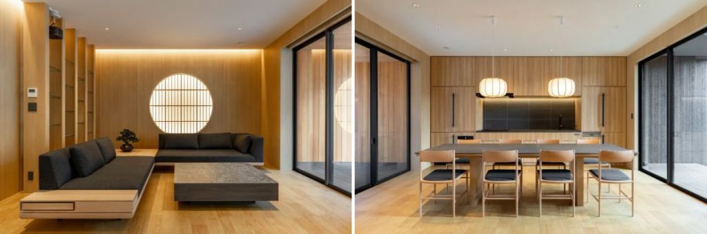 建物は総面積約240平方メートルで、最大天井高5メートルの坪庭付きバルコニーを備える。内観は黒と木目を基調とし、障子の意匠を取り入れた和モダンデザインを採用。リビング・ダイニング・キッチン・テラスは50畳を超える広さがあり、日本庭園と森を望む大開口の窓を設けたという。