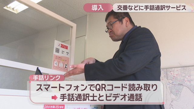 交番に設置されたQRコードをスマートフォンなどで読み取ると手話通訳士とビデオ通話ができ、手話で警察に連絡することができます。