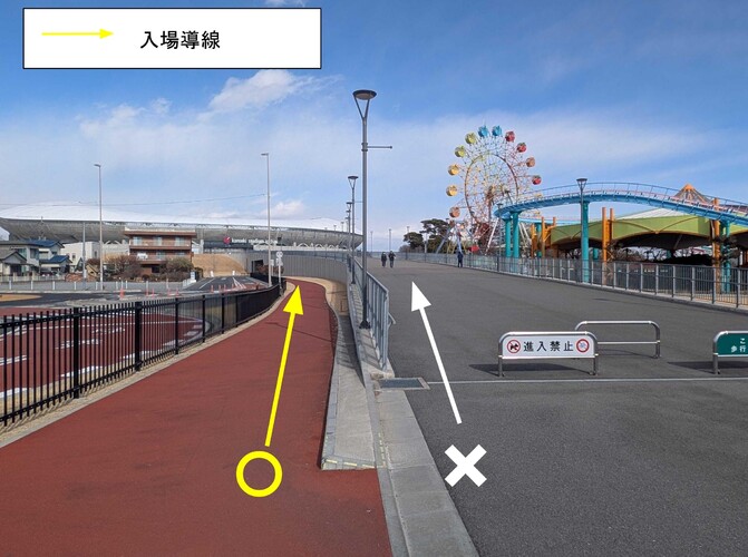 ① アプローチデッキを上がらず、側道へとお進みください。