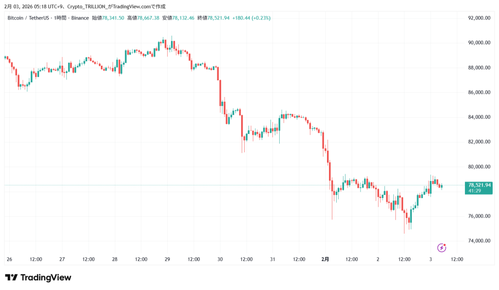 3日5時現在のビットコインの価格は78,341USDT、前日同時刻比で+1.5%の上昇となっている。