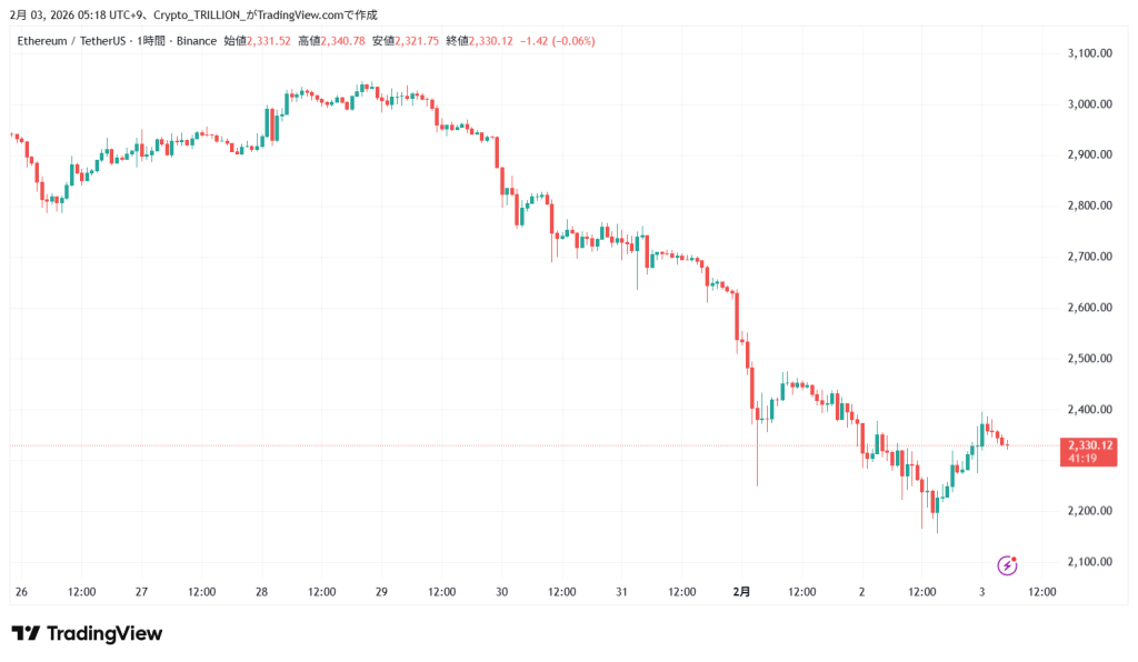 3日5時現在のイーサリアムの価格は2,331.52USDT、前日同時刻比で+0.5%の上昇となっている。