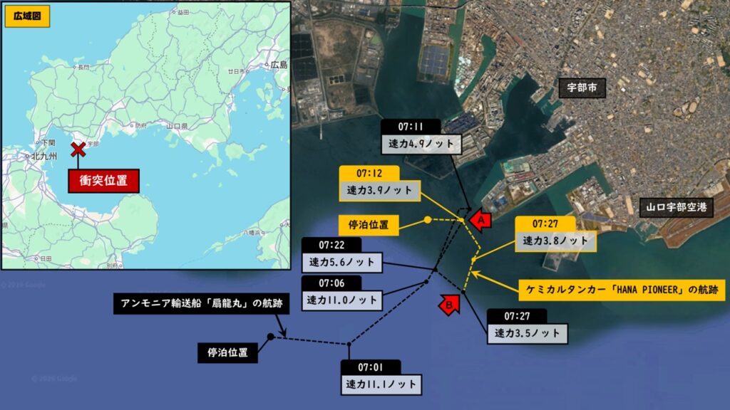 2026年2月1日、山口県宇部市の宇部港内で韓国船籍のケミカルタンカー「HANA PIONEER」とアンモニア輸送船「扇龍丸せんりゅうまる」の衝突事故が発生。