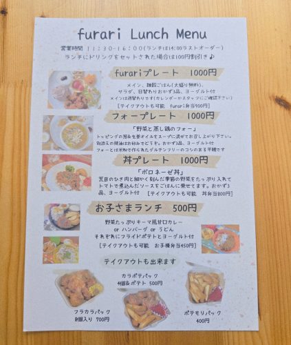 11:30~14:00までオーダーできるランチメニューは、看板メニューの「furariプレート」や、野菜と蒸し鶏のフォーがメインの「フォープレート」、ひき肉と細かく刻んだ季節の野菜をたっぷり使い、トマトで煮込んだソースがかかった「ボロネーゼ丼」など、どれも魅力的。
