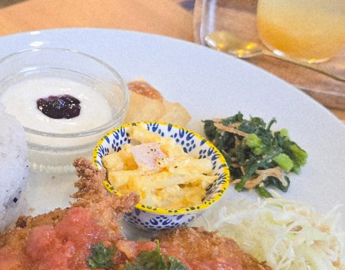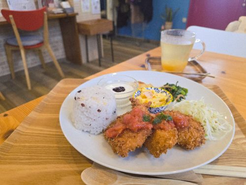 11:30〜14:00はランチタイム。看板メニューの「furariプレート」は、週替わりメインに日替わり副菜が楽しめる満足感のある一皿。この日は、塩麹に漬けたやわらかなチキンカツでした。