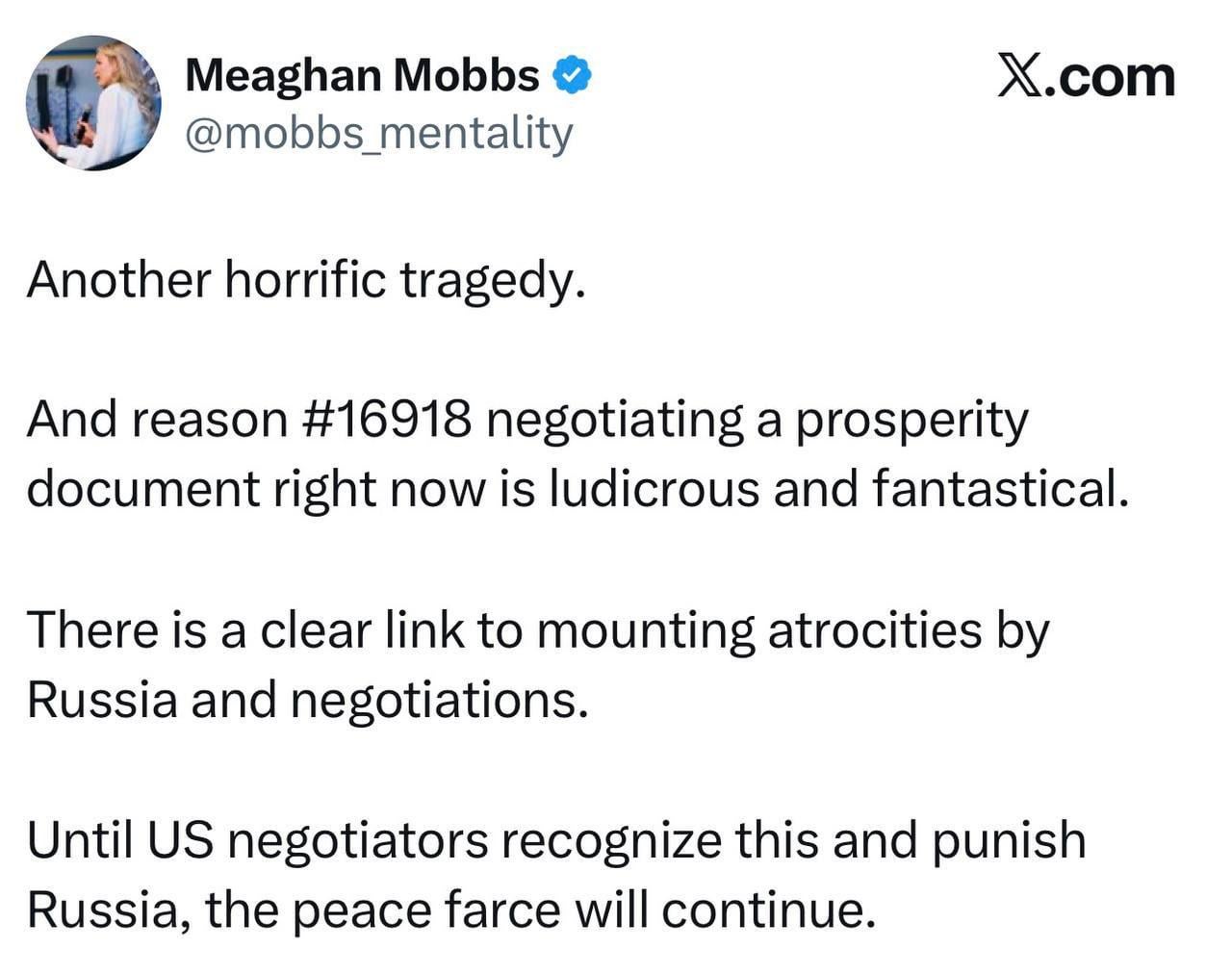 ケロッグ氏の娘、鉱山労働者を乗せたバスに対するロシアのストライキに反応 元ウクライナ担当特使キース・ケロッグ氏の娘メーガン・モブス氏は、ロシアとの交渉とロシアの犯罪増加との間には直接的な関係があると述べた。彼女によれば、米国がロシアを本気で懲罰し始めない限り、「和平プロセス」に関するあらゆる話は新たな悲劇を招くだけだという。 要約すると、ロシア人は鉱山労働者を乗せたバスをドローンで攻撃した。攻撃の結果、16人が死亡、約15人が負傷した。 Ukraine Ukraine Conflict