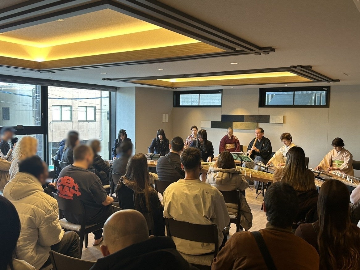 演奏会の会場には、当初の想定を上回る約50名の来場者が集まりました。その9割以上を海外からの宿泊客が占め、ラウンジで日本酒などを手に伝統音楽に心地よく耳を傾ける、和やかな国際交流の場となりました 。