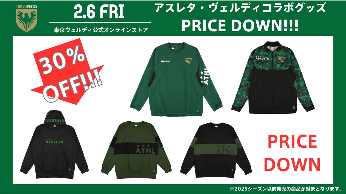 2月6日(金)より、東京ヴェルディ公式オンラインストアおよびスーパースポーツゼビオ調布東京スタジアム前店にて『アスレタ・ヴェルディコラボグッズ』の対象商品がプライスダウンとなります。