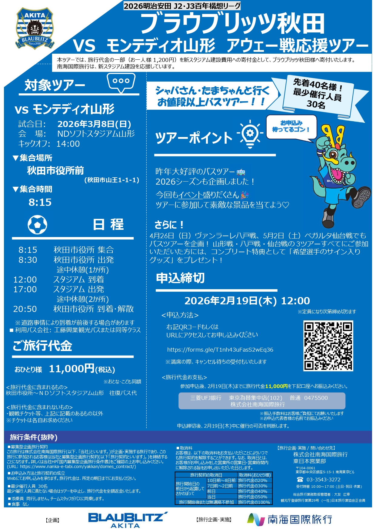 なお本ツアーでは、旅行代金の一部(お一人様1,200円)を新スタジアム建設費用の寄付金として、南海国際旅行様からブラウブリッツ秋田へ寄付していただけることになりました。