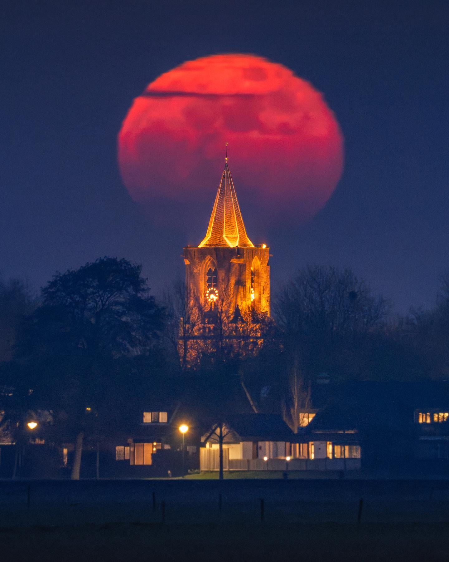 ライトアップされた教会の上に月が美しく昇りました。地平線に近い月はとても赤いです。大気の歪みにより、多少の歪みも見られます。市の西側の干拓地から 3 km 以上離れた場所から 800 mm レンズで撮影しました。 技術: Sony A7RV – Sony 400-800mm レンズ op 800mm、f/8、1.3s、ISO 4000 Netherlands