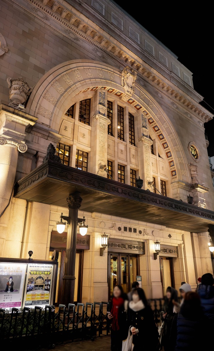 松竹座夕景。昼間とはまたひと味違う魅力的な表情を見せる=同☆