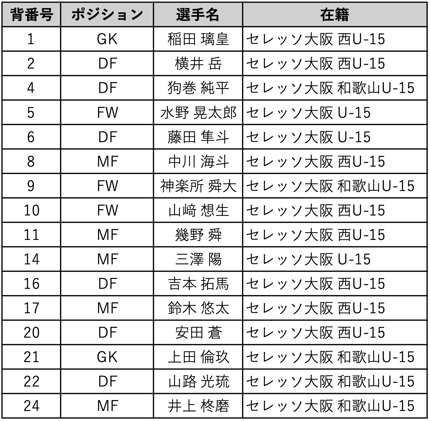 ※セレッソ大阪は、U-15、西U-15、和歌山U-15各チームより、U-13年代の選手を選抜し構成します