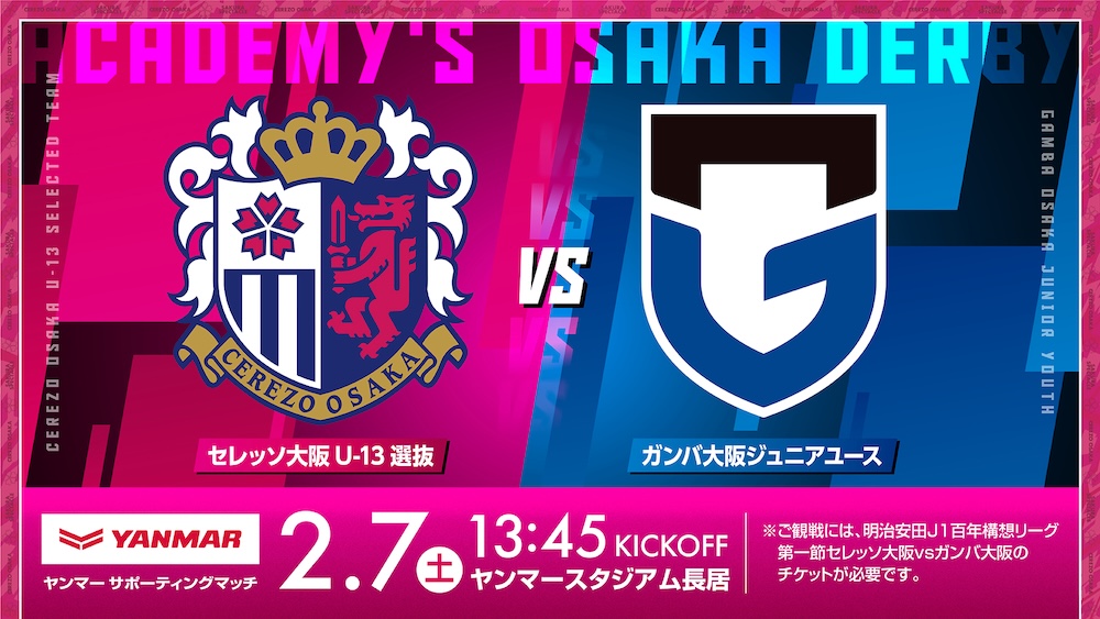 2/7(土)G大阪戦にて、C大阪U-13選抜とG大阪ジュニアユースによる前座試合の開催が決定しましたので、お知らせいたします。なお本試合は、「明治安田J1百年構想リーグ 第1節 vsG大阪」と同様にヤンマーホールディングス株式会社によるヤンマーサポーティングマッチとして開催いたします。本試合を通じて、大阪、ひいては日本サッカー界を牽引していくことを目的に、両クラブのアカデミー選手にトップチームと同じ環境での試合機会を提供し、選手の成長機会を創出してまいります。