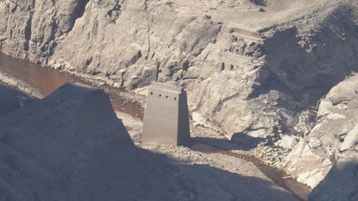 宇連ダムに1月の1カ月に降った雨の量は「1ミリ」、ダム湖の底は多くが地面がむき出しとなり、水に沈んでいた昔の橋脚なども姿を現しました。