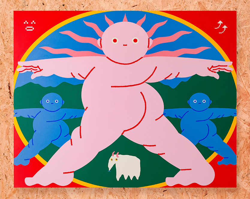 ピンクのムチムチには名前がない。性別や年齢もなく、個体でもない。非常に抽象的な存在だが「絶対念力」の集合体として私は描いている。私はシャーマンとなって、彼らをキャンバスに描き映し人々の目に見える形として具現化するのだ。その行為が、私を、鑑賞者を、「外側」の世界へと連れてゆくのである。